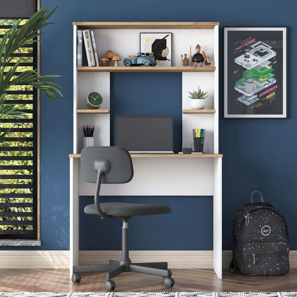 The Vireo Desk with Hutch takes your workspace to the next level. Featuring the same scratch-resistant melamine finish for durability, this desk adds an overhead hutch for extra storage and organization. The elevated hutch provides plenty of room for books, files, and office essentials, helping you keep your workspace clean and clutter-free. Whether you're working from home or in a professional setting, the Vireo Desk with Hutch combines sleek design with practical functionality.