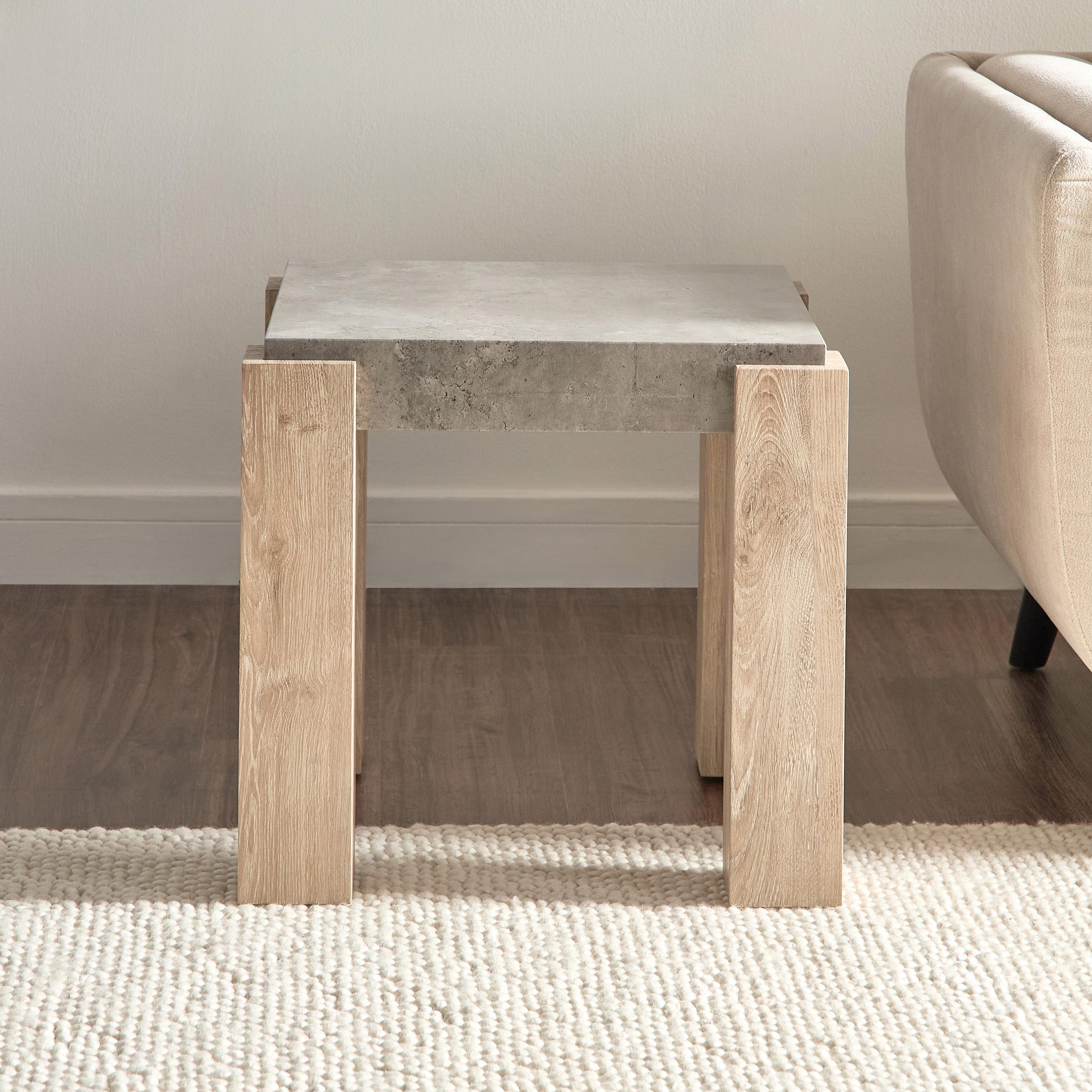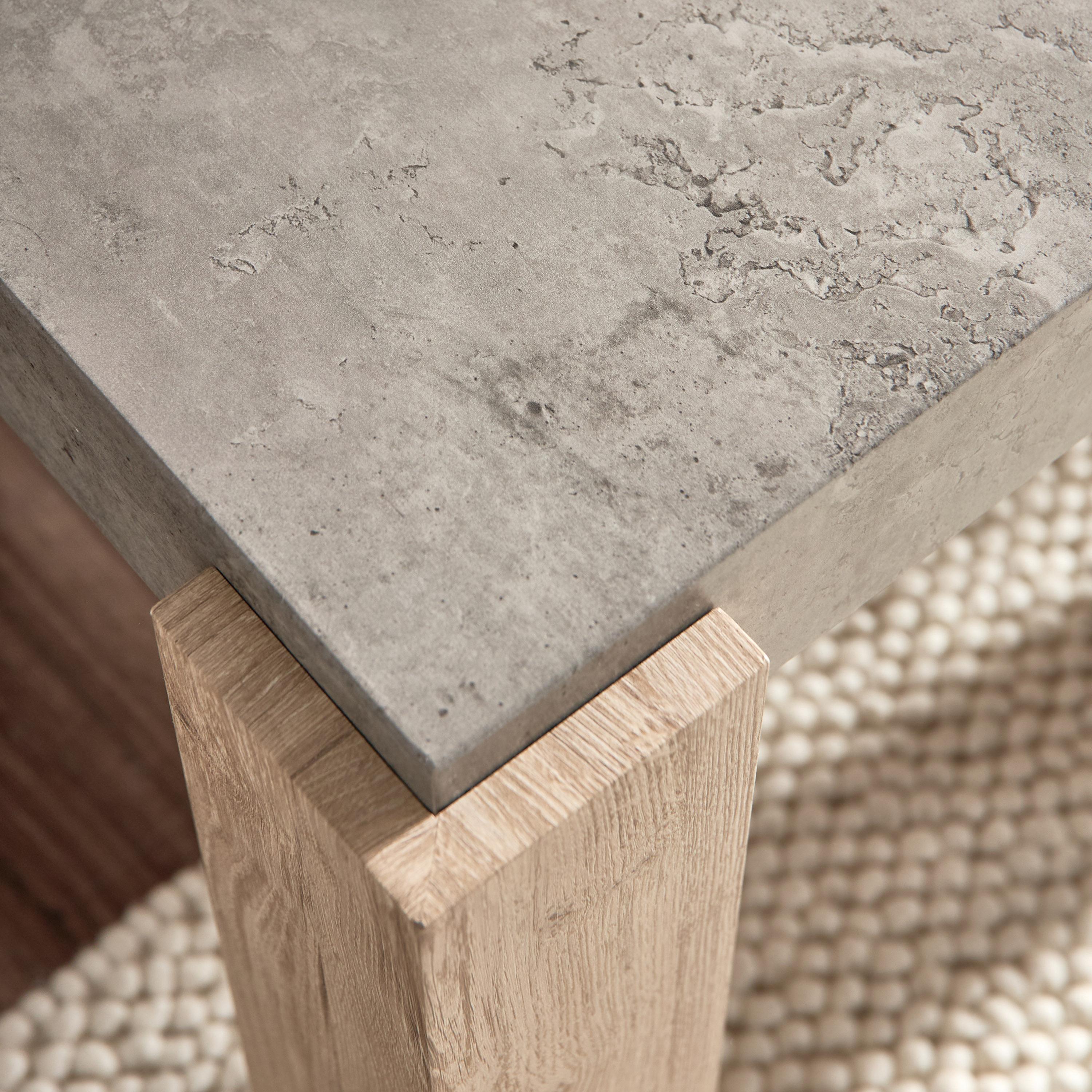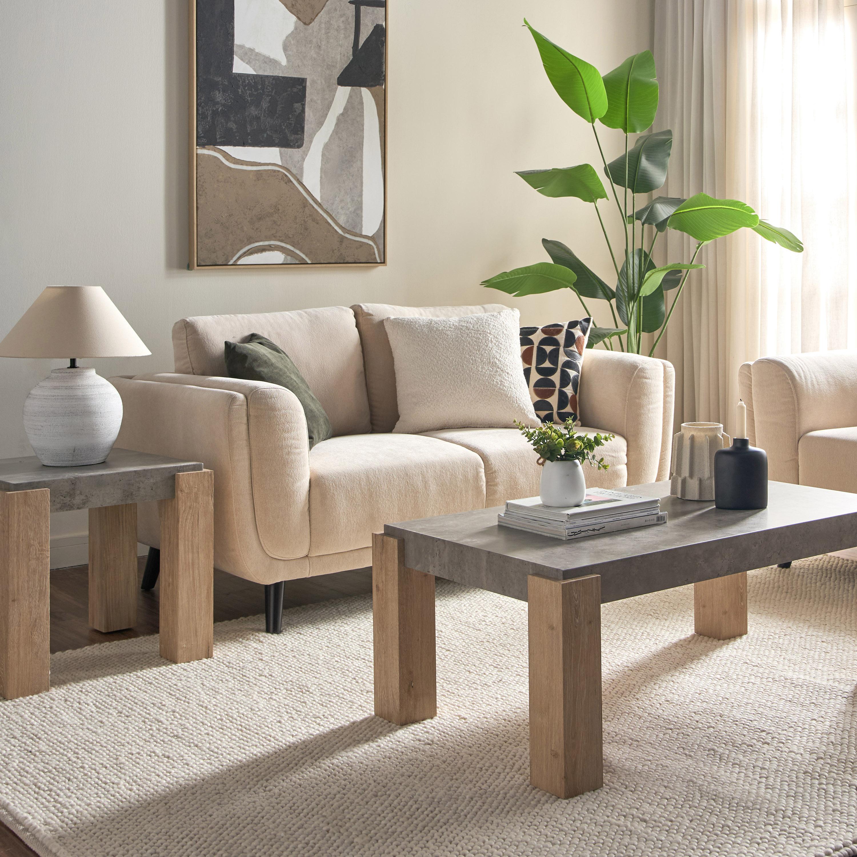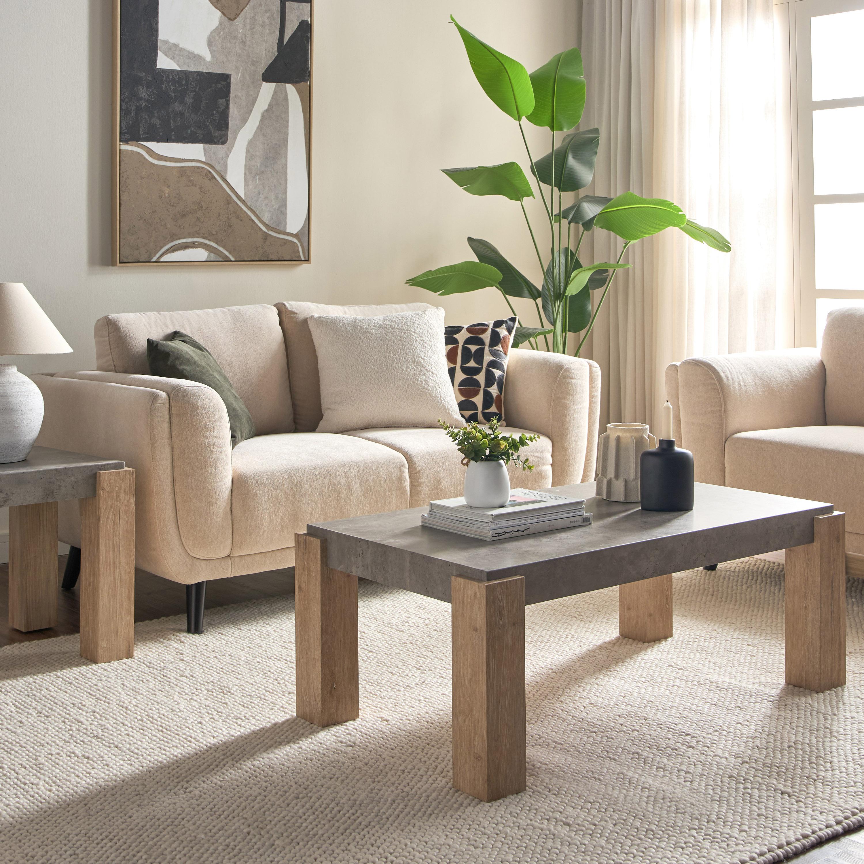 Embrace the chic and versatile appeal of our Coromio coffee table. The modern and streamlined table is accentuated with an elevated mix of finishes. The chunky tabletop is enriched showcasing the soothing texture of faux concrete veneer. Its thick pillar-style legs warm up the table with rich organic textures. Vouching for a strong architectural appeal, our coffee table lends an elevated tone and understated visual play to your living area, bedroom, or home office.