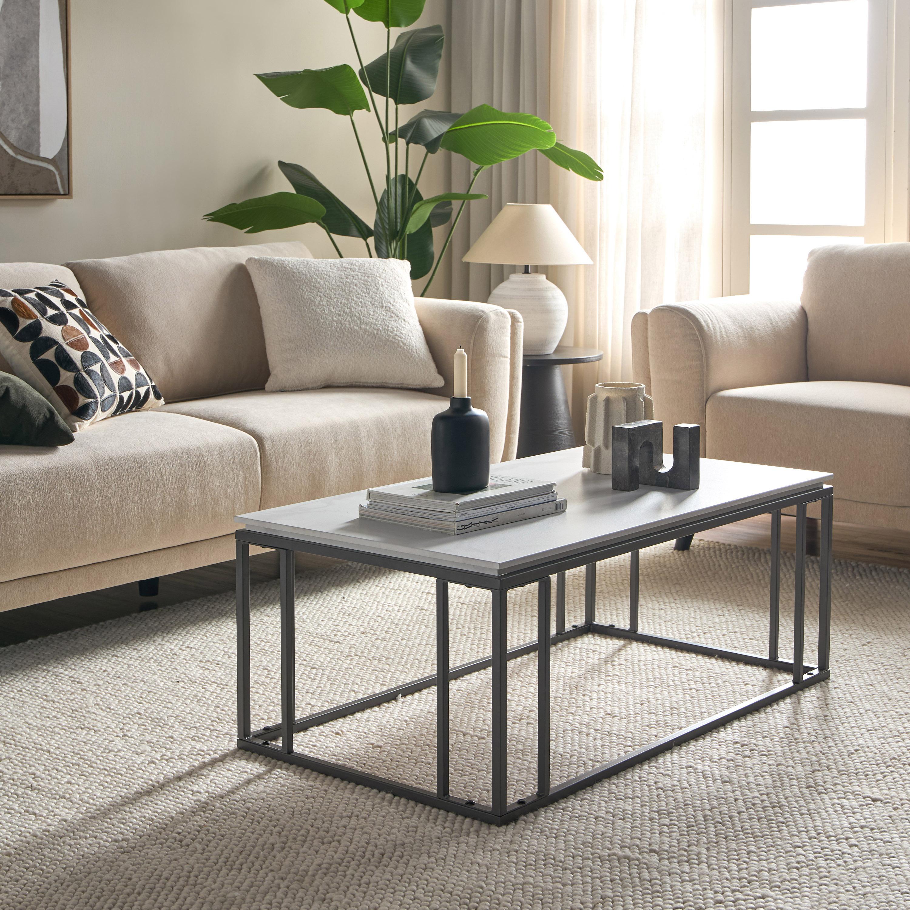 Denza Coffee Table Bring a modern style to your seating arrangement with this coffee table, which is the perfect choice for contemporary spaces. The Denza Coffee Table 110cm Long Frame is made from metal with a versatile gun powdered finish and features a top laminated with snow mountain paper veneer to bring an extra bit of storage space to your arrangement, the top serves perfectly to hold DVD remotes, magazines and TV remotes.
