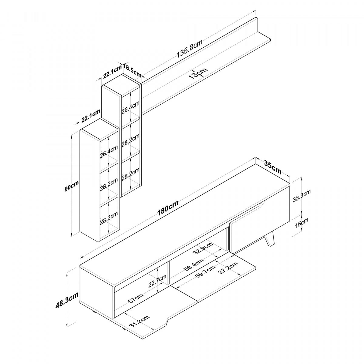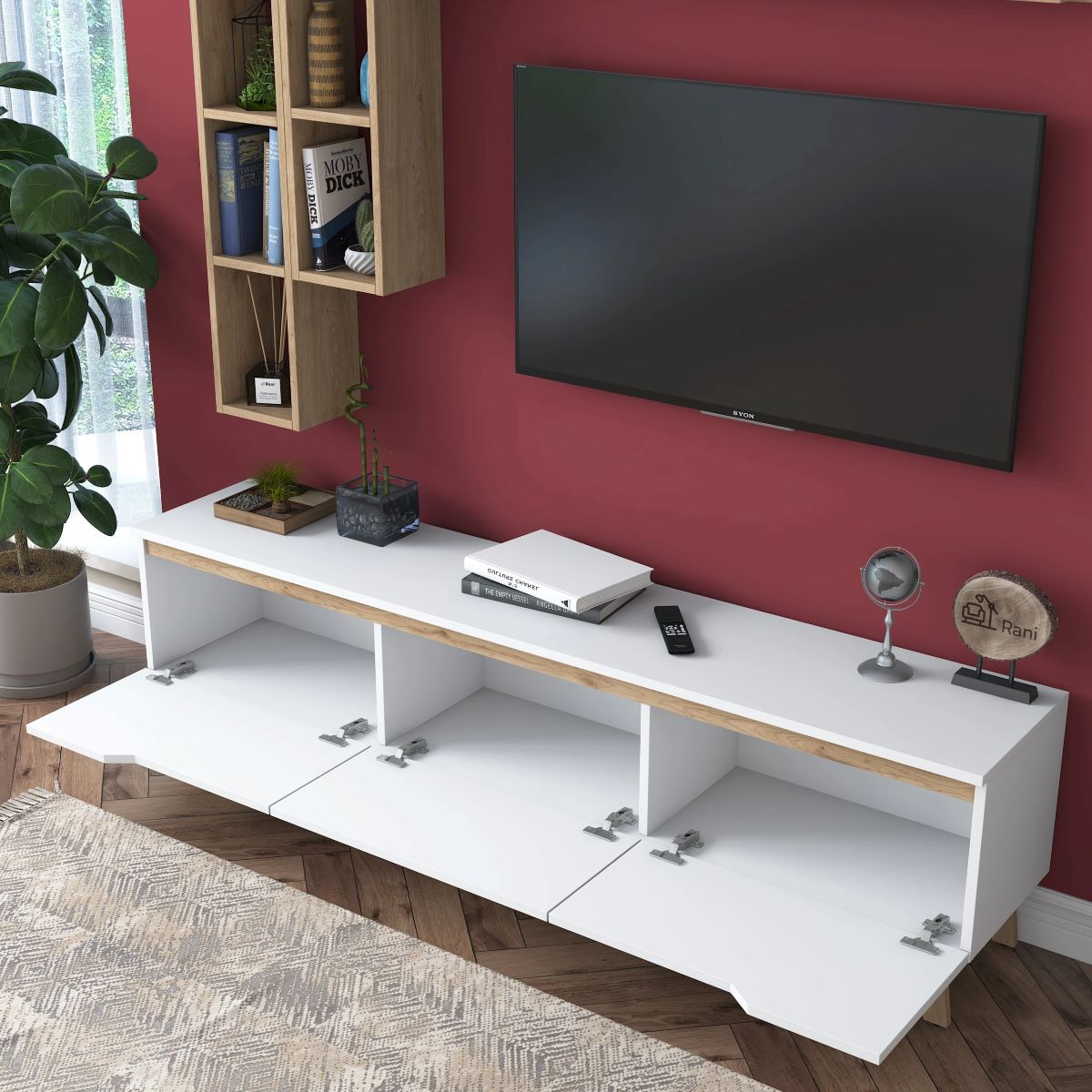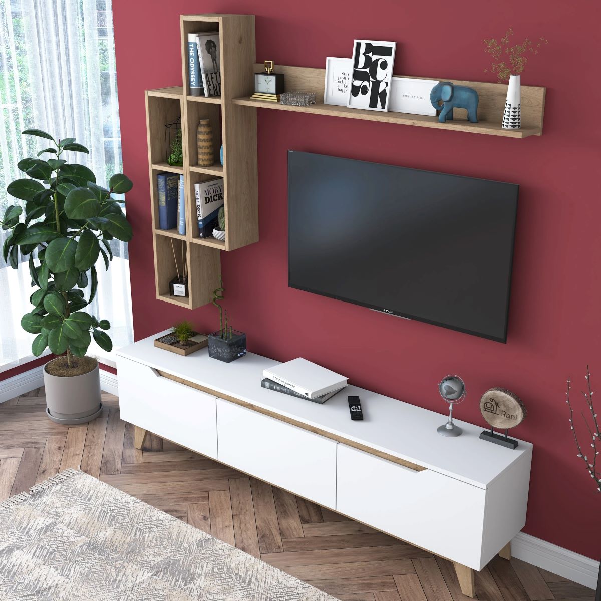 The TV stand with two shelves can be used to put all your media tools making it easy to collect and organise the cables thanks to the cable outlet on the back. The shelves that you can mount on the wall offer a perfect place to put your decorative accessories. Crafted using quality engineered wood with a melamine finish, this unit made in Turkey is a long-lasting pick for your home and office.