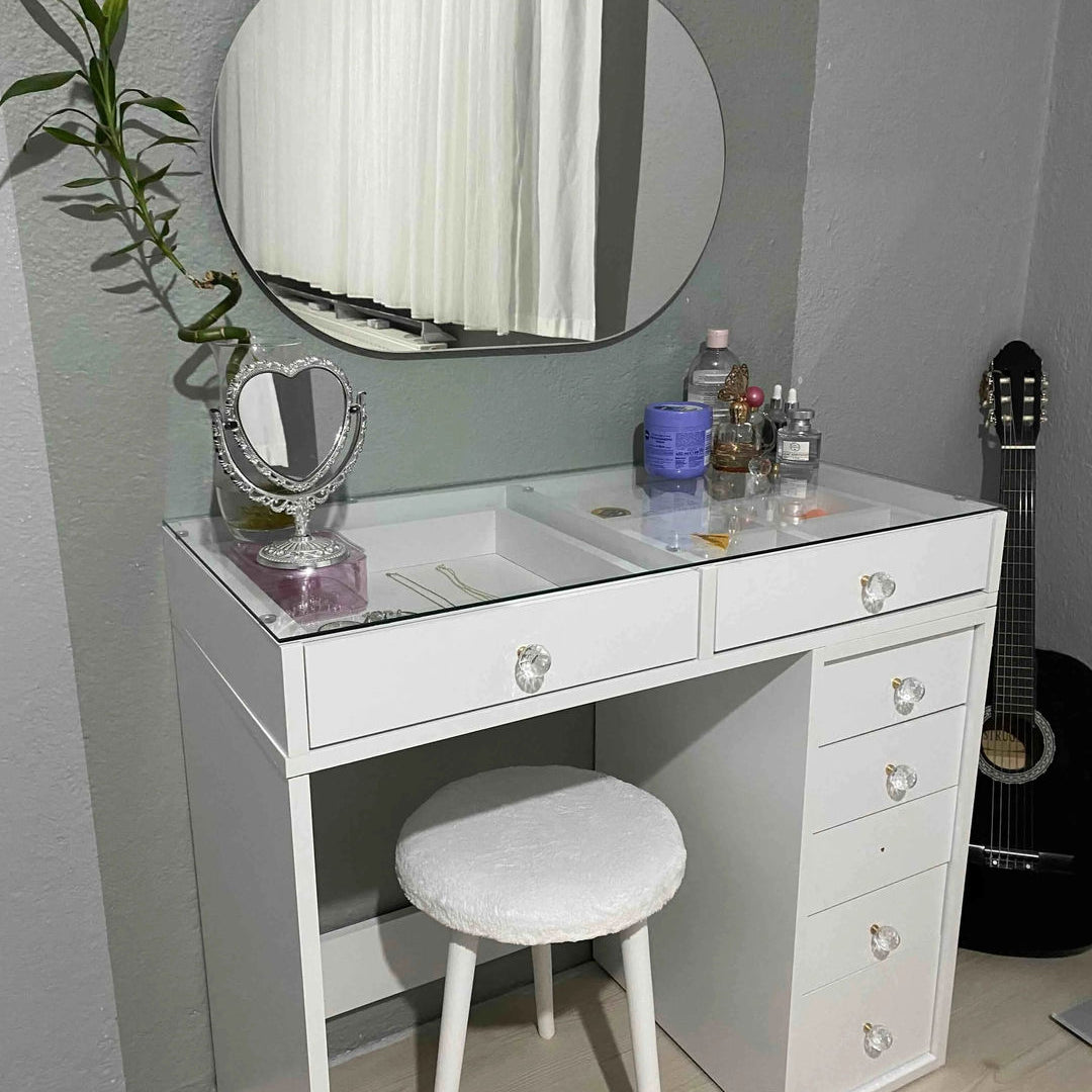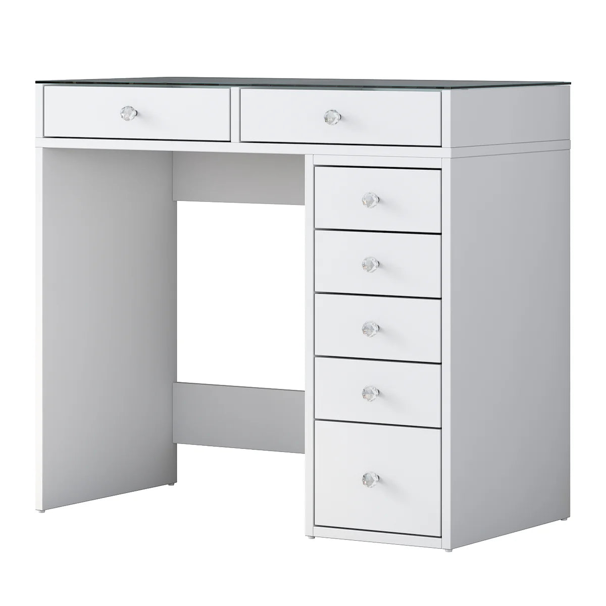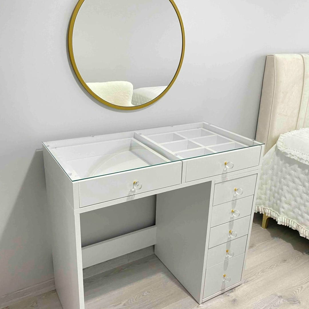 Elevate your beauty space with the Home Canvas Flux Minimalist Vanity. This modern white vanity table features seven spacious drawers and a glass-top storage compartment for easy viewing and organization of cosmetics, skincare, and accessories. Its sleek design and compact footprint make it perfect for bedrooms or dressing areas, combining style and functionality while keeping your beauty essentials beautifully displayed and within reach.