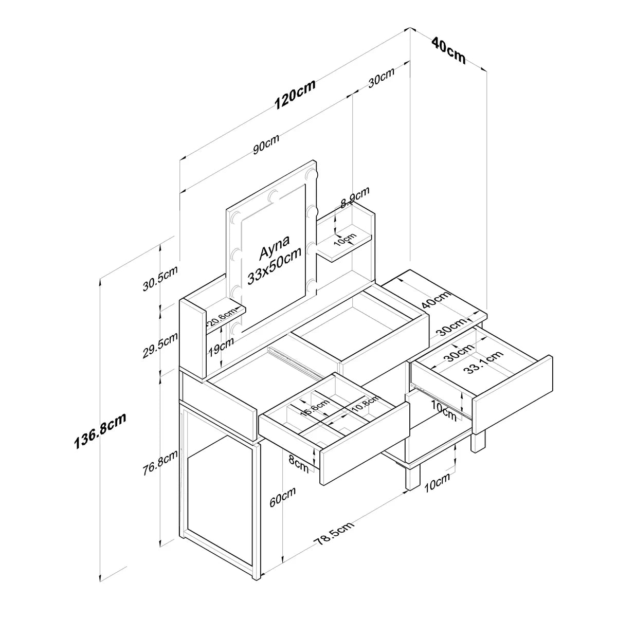 • Open side shelves for perfumes, skincare, or decor