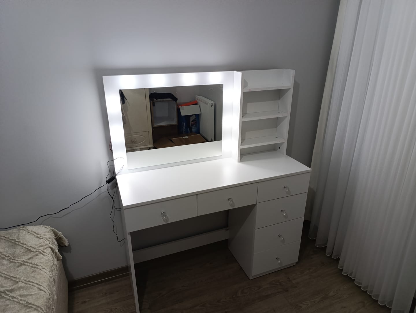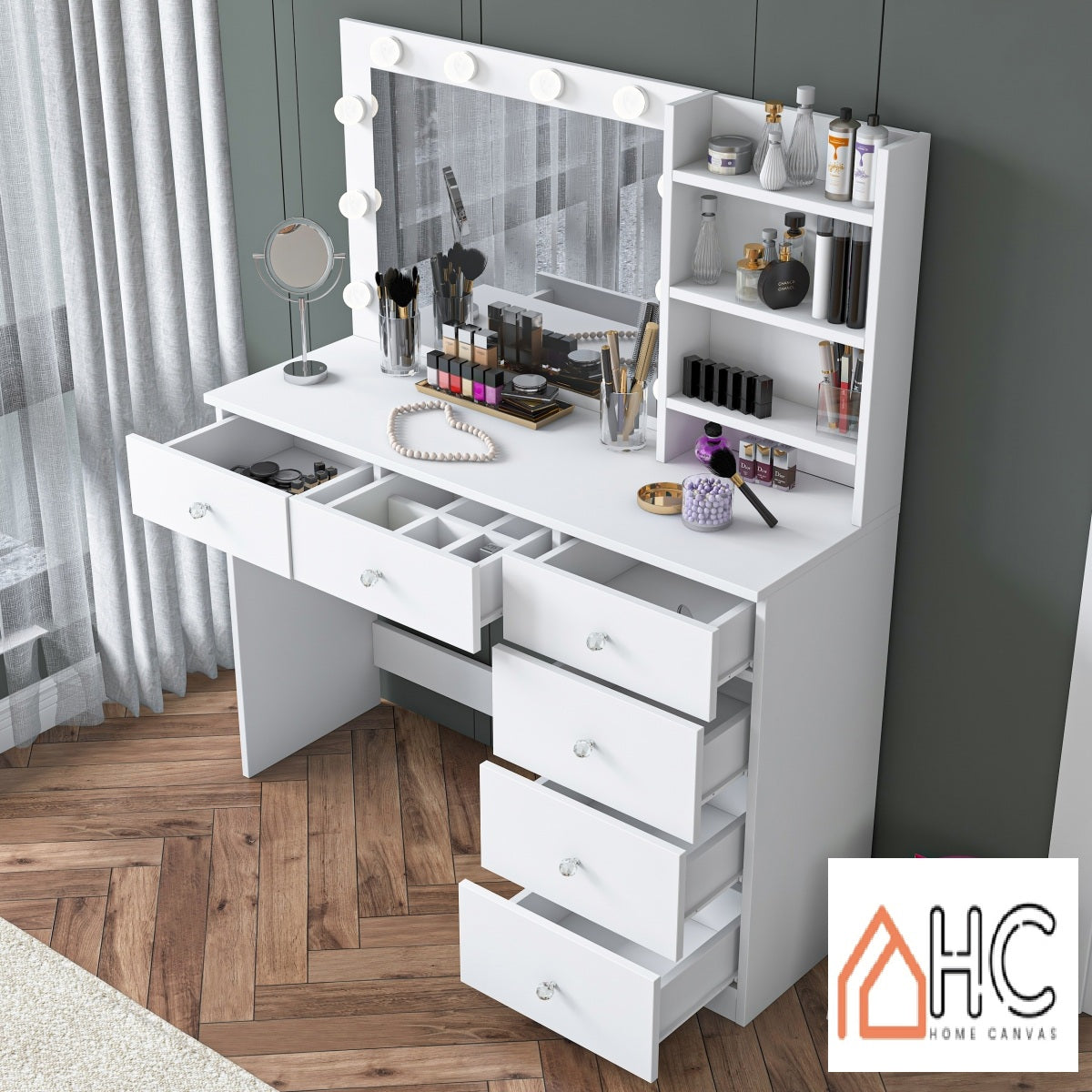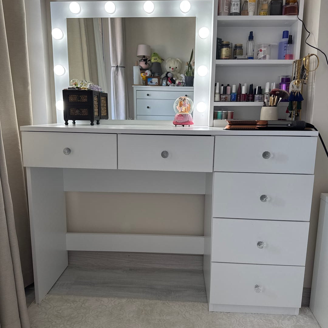 Upgrade your beauty space with the Home Canvas Starlight Glam Vanity. This elegant Hollywood-style vanity features a large LED mirror with bright globe lights for studio-quality illumination. It offers three top drawers, a side column with five additional drawers, and open shelving for perfumes, brushes, palettes, and décor items. The spacious countertop keeps daily essentials organized, while the sleek white finish and crystal-style knobs add a chic, contemporary touch. Perfect for bedrooms, dressing rooms, or professional beauty spaces