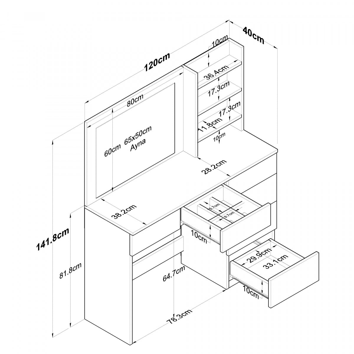 • Open shelves for perfumes, brushes, palettes, and décor items