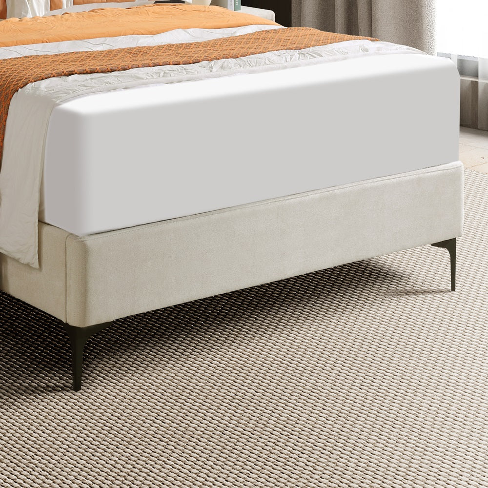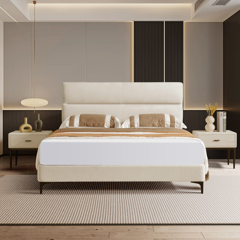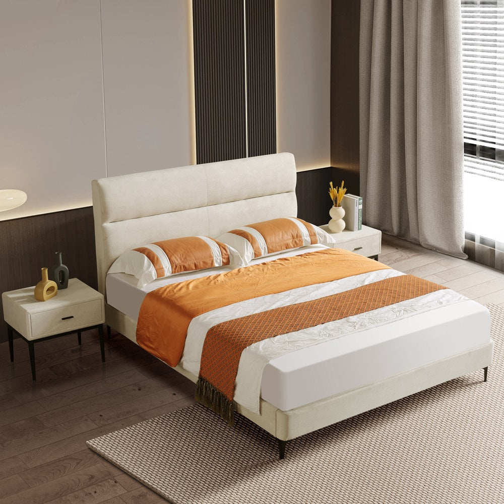 The KYOTO Upholstered Bed combines modern simplicity with exceptional comfort. Featuring a straight-line headboard with clean, minimalist lines, this bed is perfect for those who appreciate sleek design. The padded headboard offers extra comfort for lounging or reading. Finished in a sophisticated beige-colored fabric, it seamlessly complements a variety of interior styles. Raised off the floor for easy cleaning, the bed rests on stylish metal feet, ensuring both practicality and contemporary elegance.